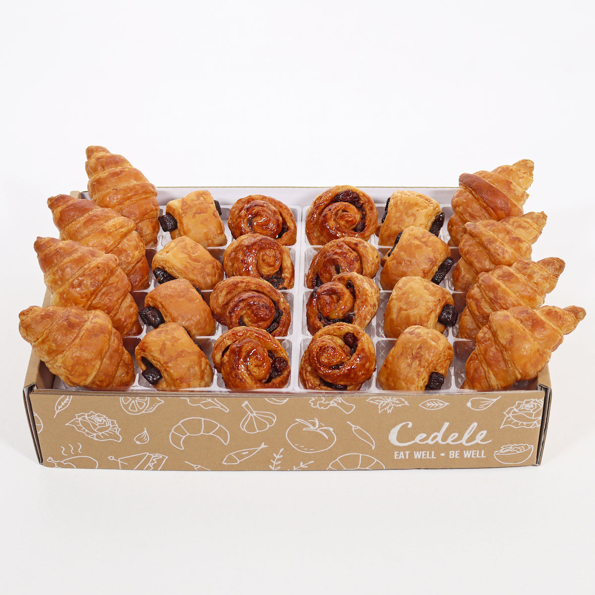 A delightful assortment of pastries for any occasion! Enjoy the buttery goodness of our Butter Croissants, indulge in the rich flavour of our Chocolate Croissants, and savour the sweet combination of raisins and cinnamon in our Raisin Cinnamon Danish. Perfect for gatherings or events, our Mini Danish Party Box is sure to please every palate.